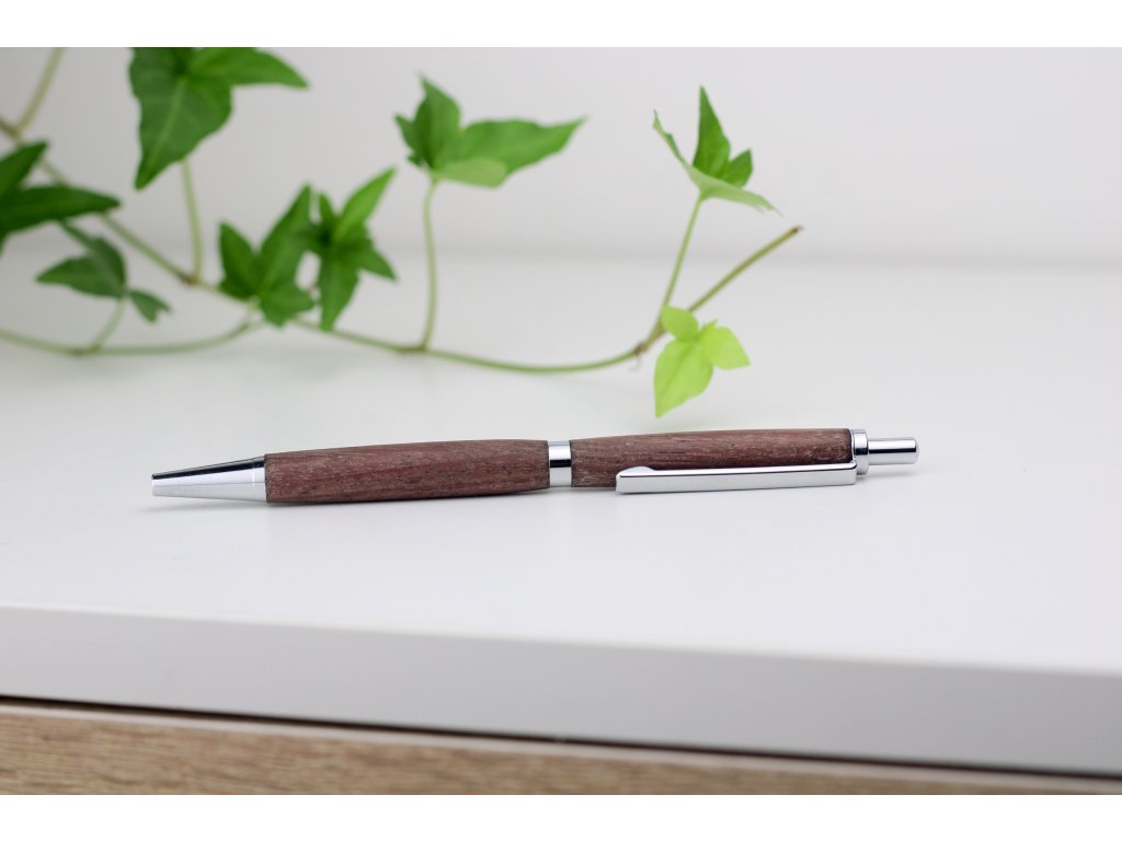 Ručně vyrobené tělo kuličkového pera je z pečlivě vybraného dřeva Amarant, které se vyznačuje výraznou kresbou a sytými červenofialovými až hnědými tóny. Povrch pera je ošetřen kvalitním voskovým olejem, jenž zvýrazňuje strukturu dřeva, zajišťuje příjemný pocit při držení a poskytuje ochranu při běžném používání. Ergonomicky tvarované tělo nabízí pohodlný a jistý úchop, vhodný i pro delší psaní. Klikací mechanismus je precizně zpracovaný, zaručuje spolehlivou funkčnost a plynulé ovládání. Pero je kompatibilní s běžně dostupnými kuličkovými náplněmi, což umožňuje snadnou výměnu a dlouhodobé používání. Spojení výrazného přírodního materiálu a praktického zpracování činí z tohoto pera vhodný doplněk pro každodenní použití i vkusný dárek.