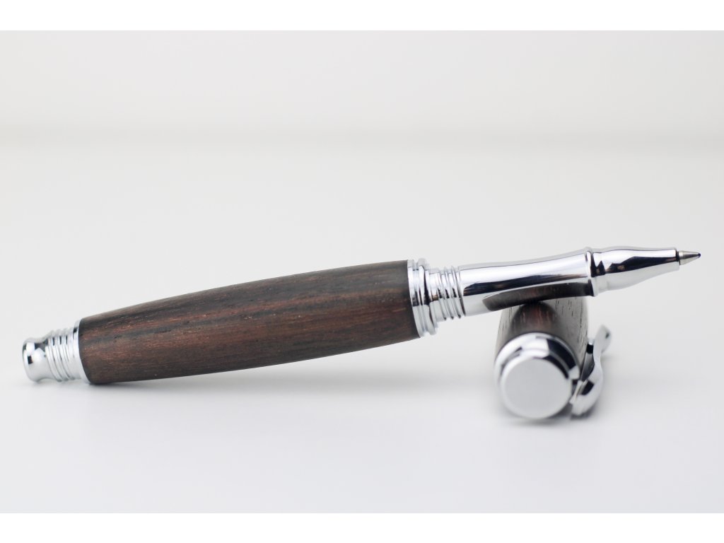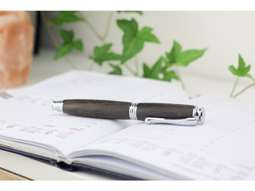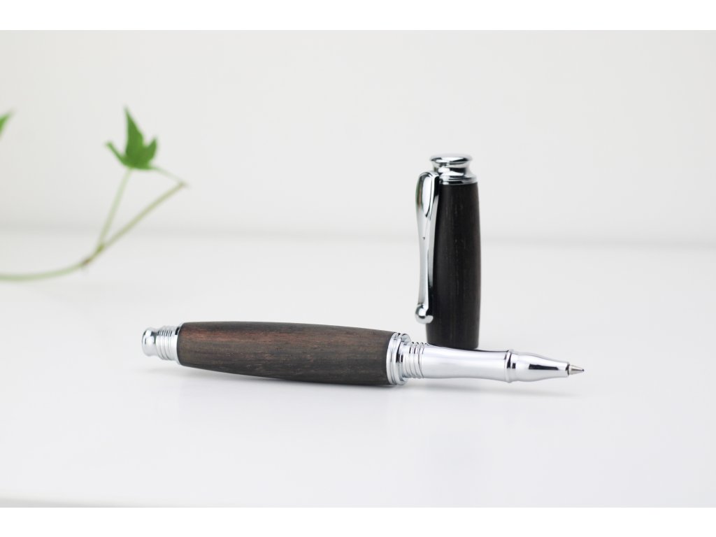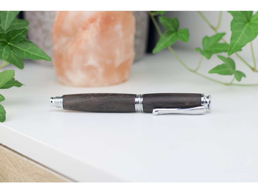 Sofistikovaný design: Spojení přírodního ebenového dřeva a stříbrných detailů dodává peru luxusní a nadčasový charakter.
