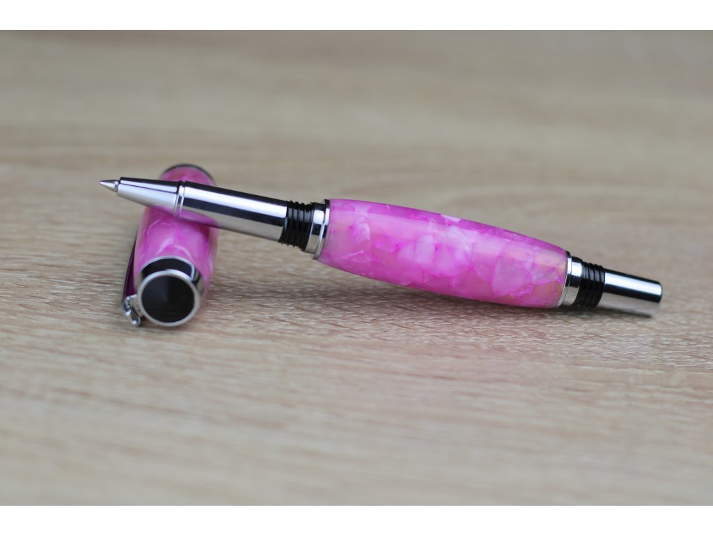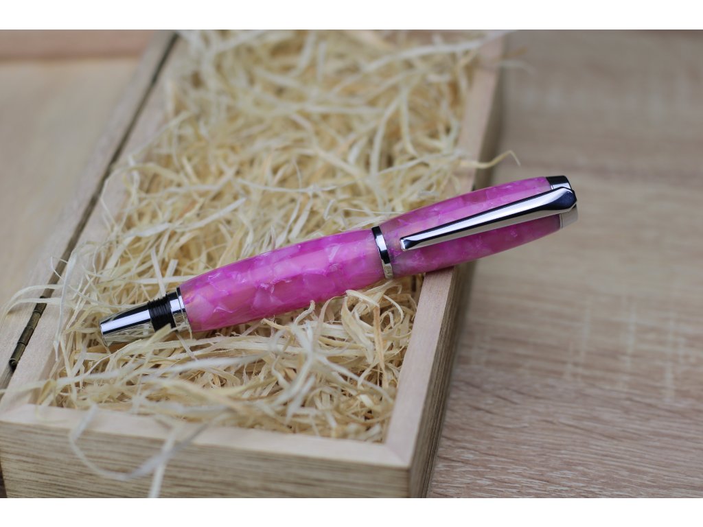 Toto elegantní plnicí pero je vyrobeno růžového akrylu, jehož transparentní hloubka a sytá barva okamžitě upoutají pozornost. Růžový akryl nabízí nejen výrazný vizuální dojem, ale i vynikající mechanické vlastnosti. Díky preciznímu ručnímu zpracování je každé pero originálem s jemně odlišnou kresbou a charakterem.