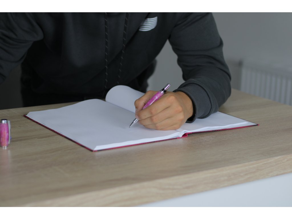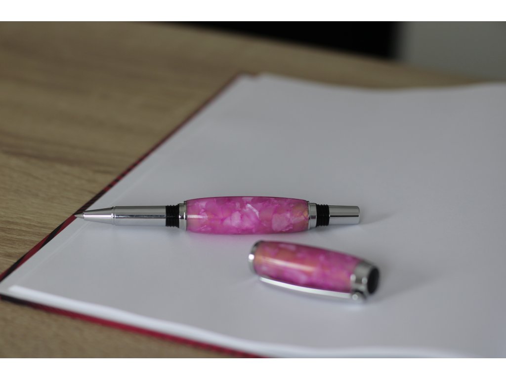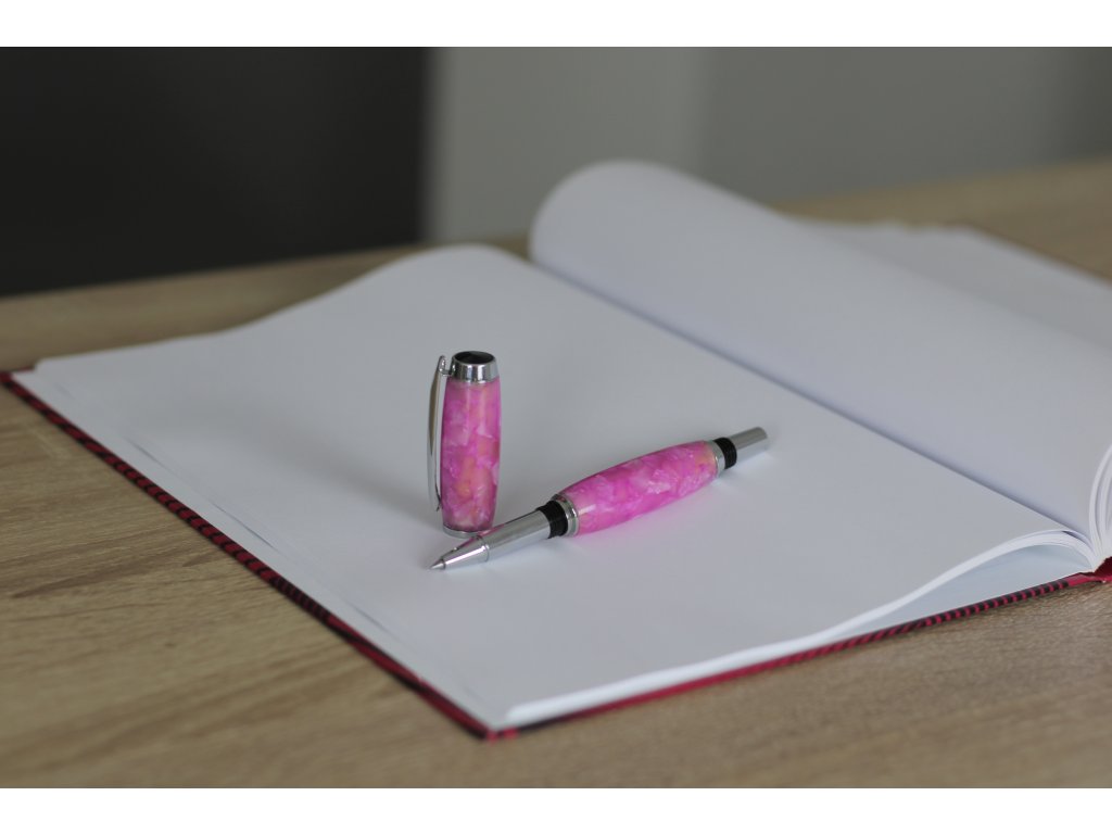 • Moderní materiál: Celé tělo pera je vyrobeno z kvalitního růžového akrylu s hlubokým leskem a atraktivní průsvitností. Každý kus má jedinečné barevné nuance a odlesky.