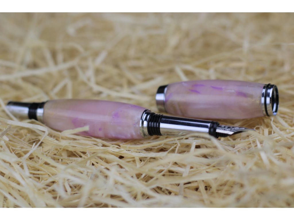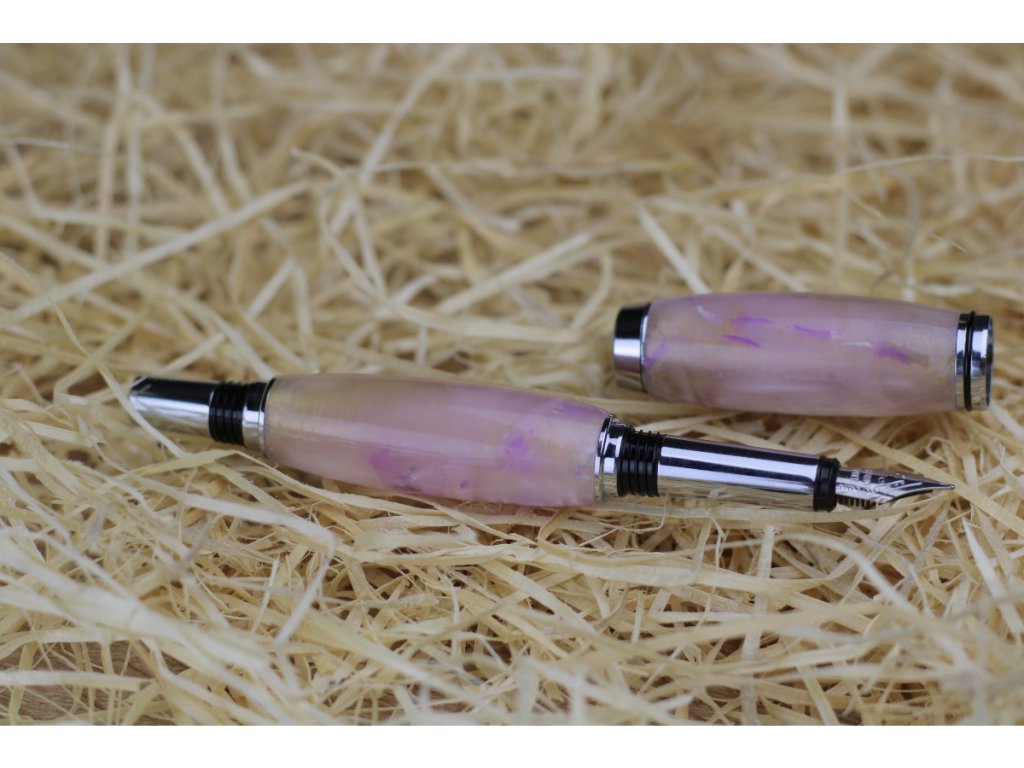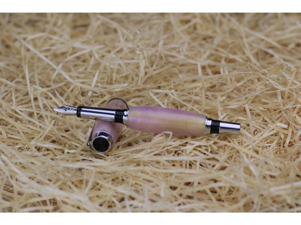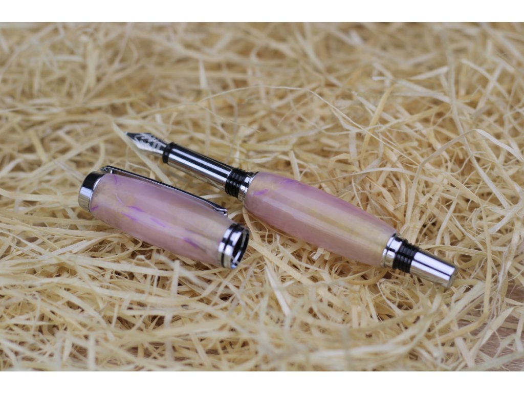 Ručně vyráběné bombičkové pero z kvalitní akrylové pryskyřice ve světle růžovém průhledném provedení s jemnými fialovými pruhy. Každý kus je originál s neopakovatelným průběhem barev a elegantním leskem, který podtrhuje moderní a sofistikovaný vzhled pera.