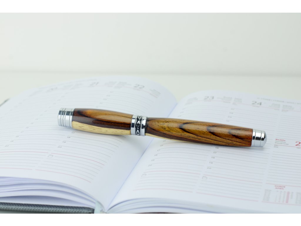 Toto elegantní plnicí pero je vyrobeno z exotického dřeva cocobolo, které vyniká svou bohatou kresbou s kontrastními liniemi a přirozenými odstíny od teplé červenohnědé po tmavé tóny. Cocobolo je ceněno pro svou tvrdost, odolnost a mimořádně dekorativní vzhled, díky čemuž působí pero velmi reprezentativně. Každý kus dřeva je originál, a proto je i každé pero naprosto jedinečné. Tělo pera je ošetřeno povrchovou úpravou CA finish, která zvýrazňuje přirozenou krásu dřeva, dodává vysoký lesk a zároveň zajišťuje hladký a příjemný povrch na dotek.
