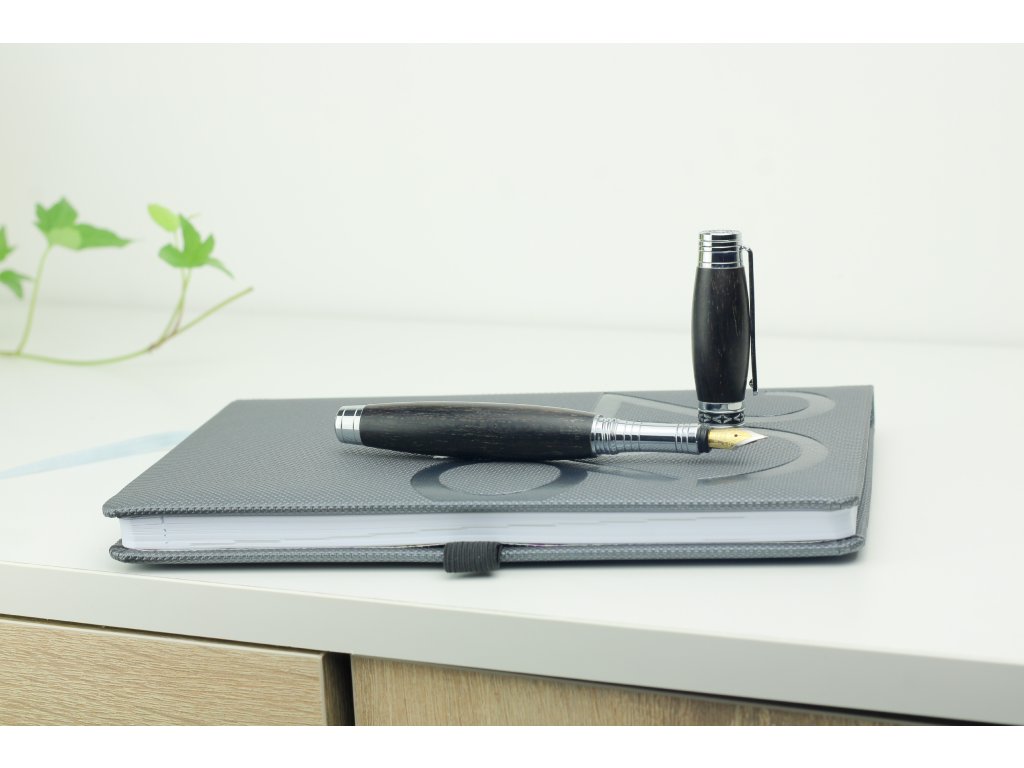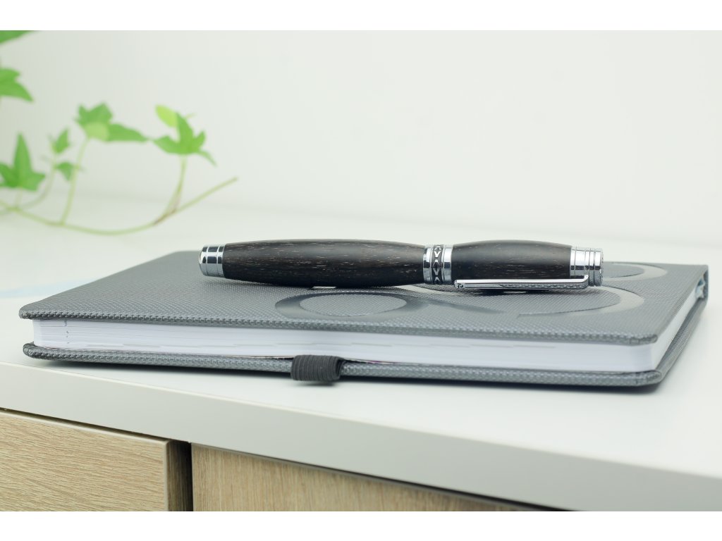 Sofistikovaný design: Ergonomický tvar pro příjemný úchop a lepší kontrolu při psaní, doplněný stříbrnými komponenty.